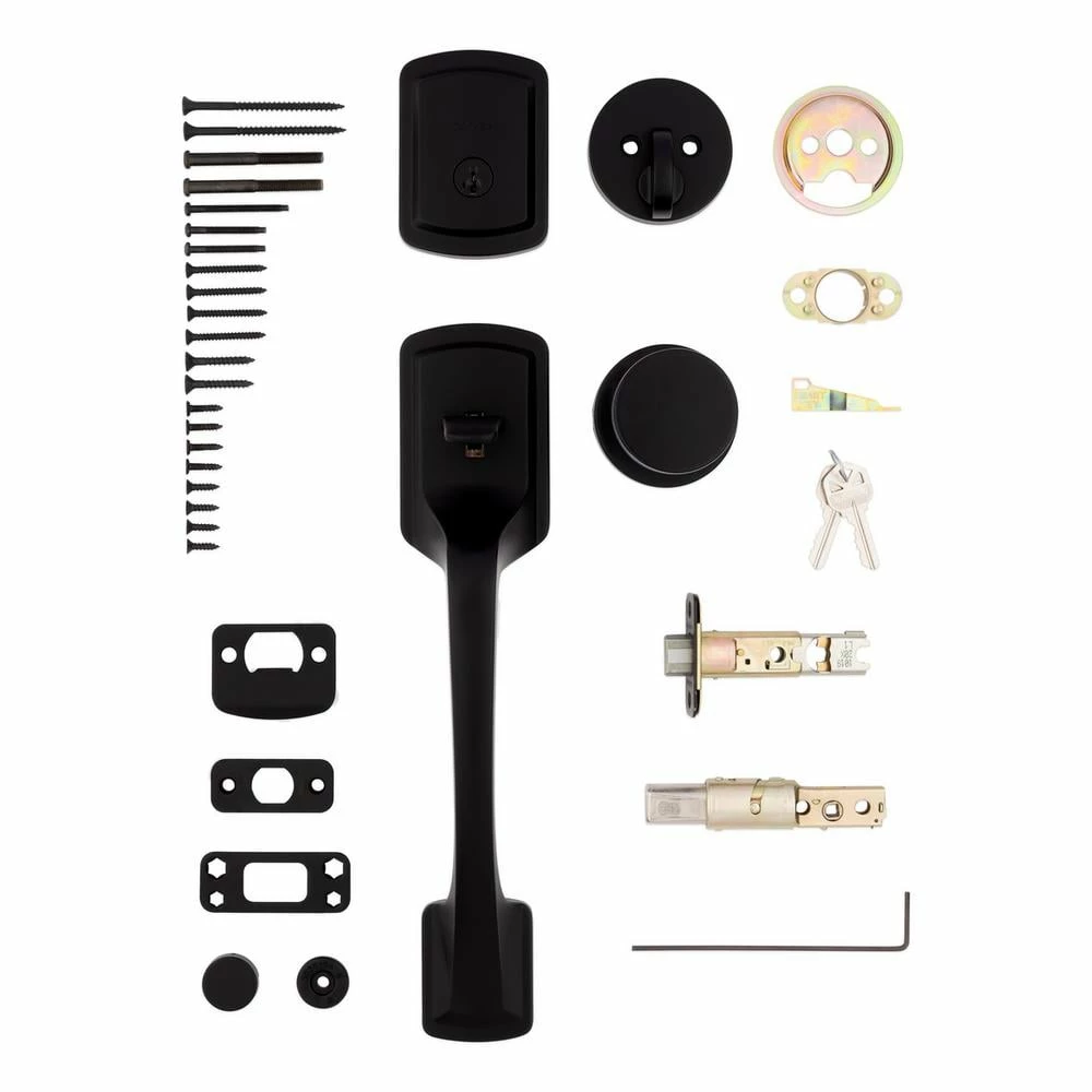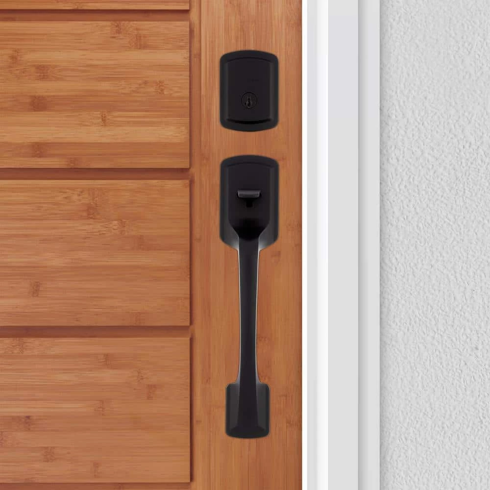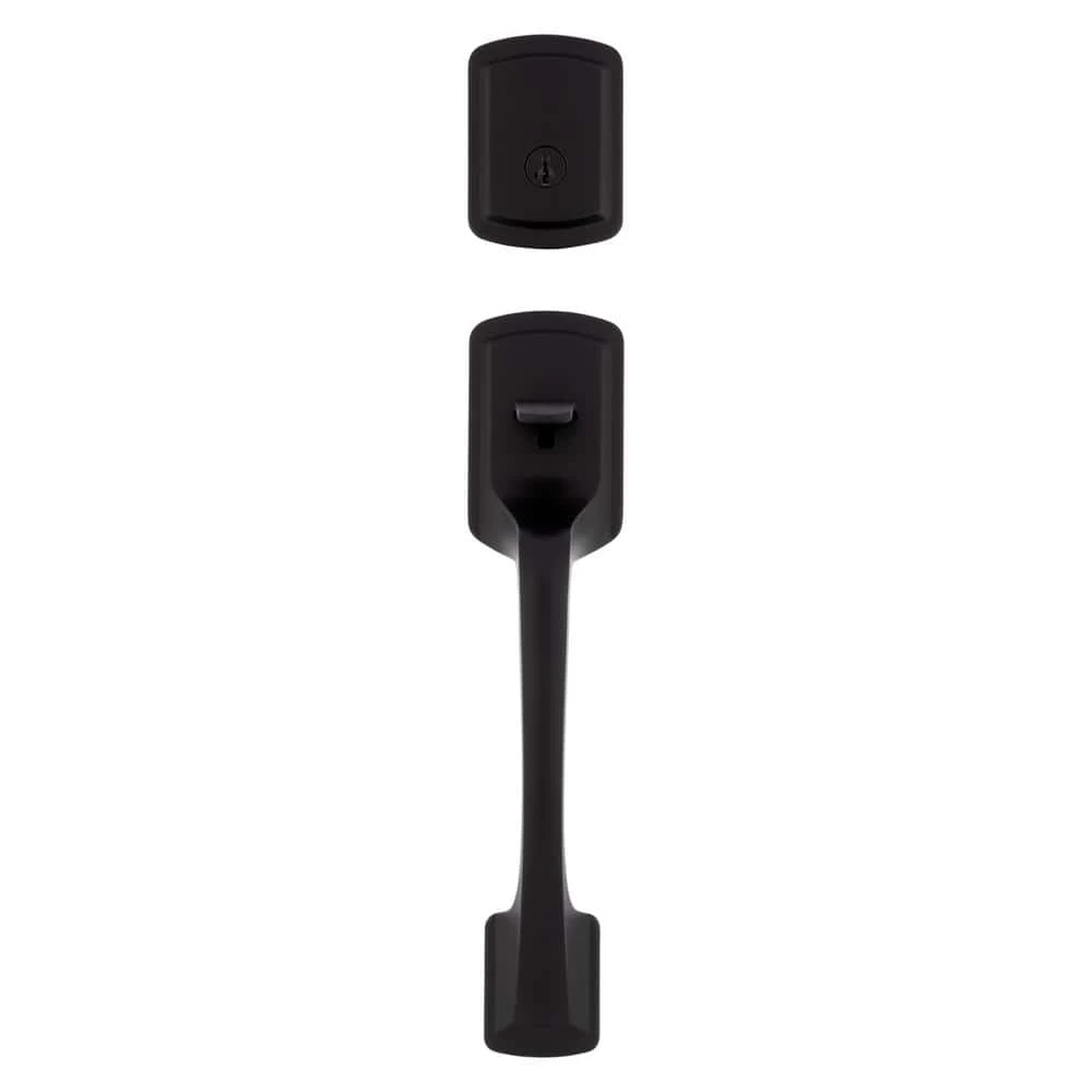 Step up to designer styles and superior security with Kwikset Signature Series products. The Prague handleset has a sleek contemporary design that complements transitional and modern homes. The clean lines and soft curves of this handleset bring style to any home while maintaining superior security. The latch bolt is operated by the thumb piece on the outside and the grip on the inside. The deadbolt is operated by a key on the outside and a thumb turn on the inside. The rich tones of Matte Black add the finishing touch to this product. The Matte Black finish provides a rich and warm complement to the product’s style.